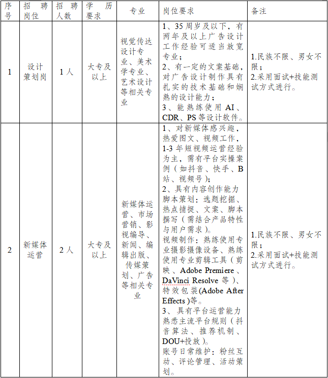 澄江市文化旅游投資開發(fā)有限責(zé)任公司數(shù)字傳媒分公司致力于服務(wù)澄江傳媒和文化產(chǎn)業(yè)發(fā)展,主要業(yè)務(wù)有影視制作、新媒體平臺運(yùn)營、戶外廣告位經(jīng)營、廣告物料設(shè)計(jì)制作、文化傳播、活動策劃等。為提高公司業(yè)務(wù)經(jīng)營能力,加強(qiáng)國有企業(yè)人才隊(duì)伍建設(shè),結(jié)合公司發(fā)展及相關(guān)計(jì)劃安排,擬面向社會公開招聘工作人員3名,F(xiàn)將有關(guān)事項(xiàng)公告如下: