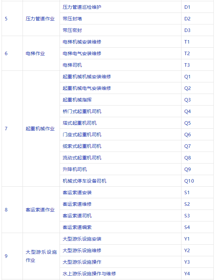 特種設(shè)備安全管理人員、叉車司機(jī)、起重機(jī)司機(jī)、起重機(jī)指揮、壓力容器、鍋爐、氣瓶充裝、電梯安裝與維修、觀光車、客運(yùn)索道操作與修理、大型游樂(lè)設(shè)施操作與維修等等。